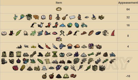 这里要解释一下,游戏中一天的时钟被划分为16格,每格大概是30秒,从图中可以看出,供奉一只贱贱的螃蟹可以延缓一天的爆发时间,而供奉黑曜石效果则与此相反。所以如果你先后加入一只螃蟹和一块黑曜石,那么你除了被扣6点血之外不会获得任何效果。