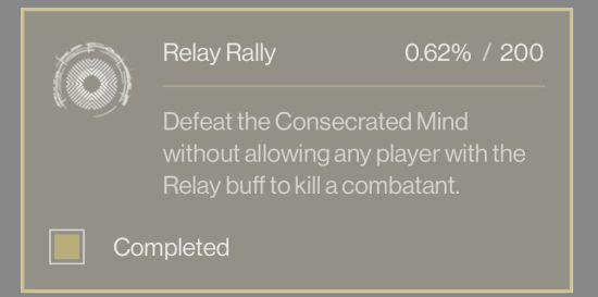 打法:此成就拥有buff的人员不能杀任何怪,小怪和大牛都不可以。Gambit组规定一个人永远留在继电器处杀怪,另外两人轮换存荧光,存完帮着破盾,等下一个人轮换。开怪推荐机制组进行连线,之后立即到中间利用boss自杀消除buff,这里是可以自己复活的。