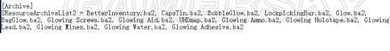 SResourceArchiveList2 = BetterInventory.ba2, CapsTin.ba2, BobbleGlow.ba2, LockpickingBar.ba2, Glow.ba2, BagGlow.ba2, Glowing Screws.ba2, Glowing Aid.ba2, UHDmap.ba2