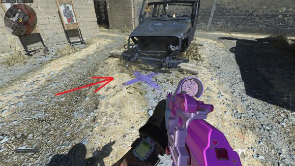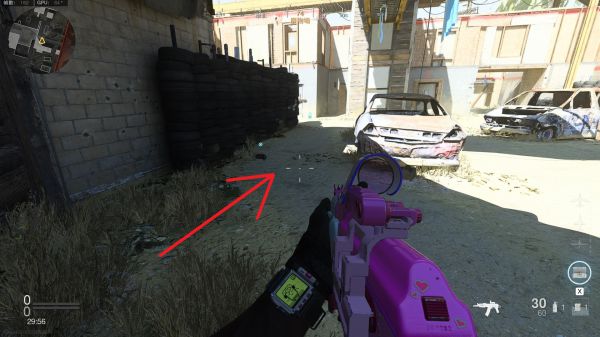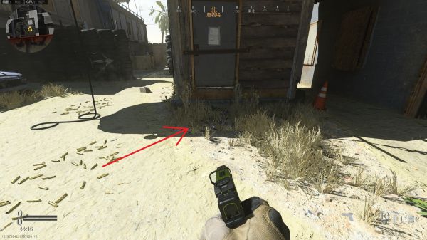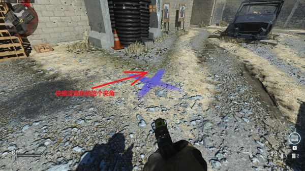 从废车场炸简陋小屋前门距离太远只能使用破片手雷,需要我们走到这个位置(不需要紧靠柱子),这个位置不会受到来自中路的敌人攻击:
