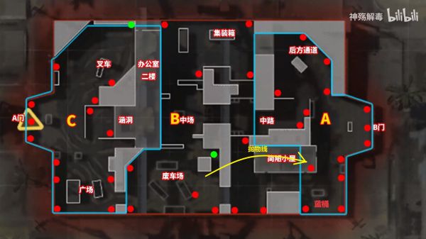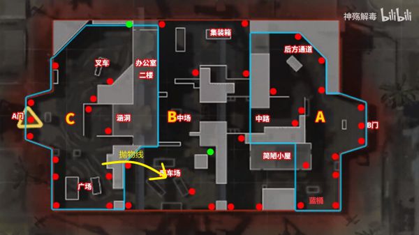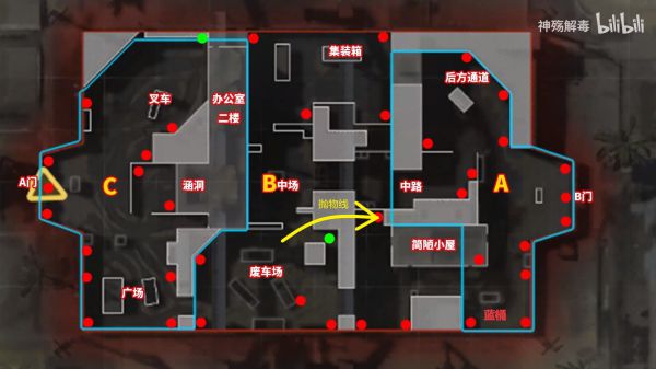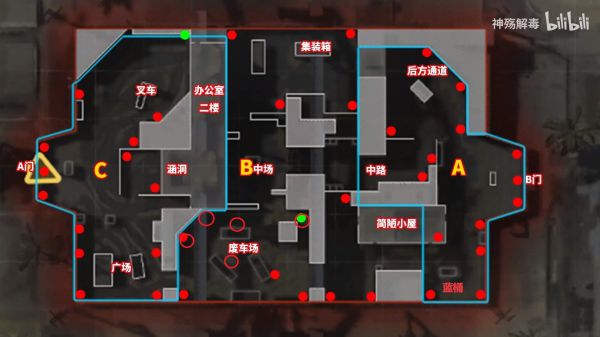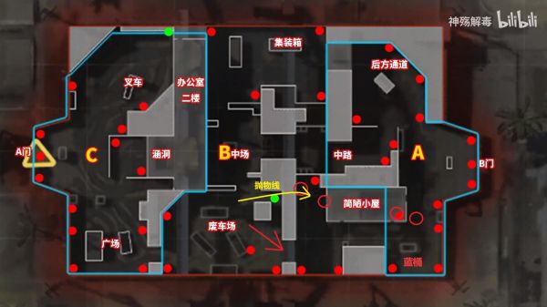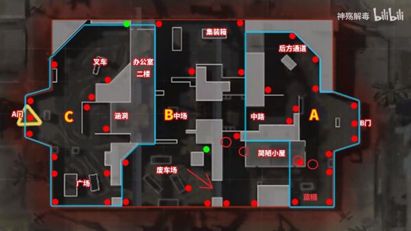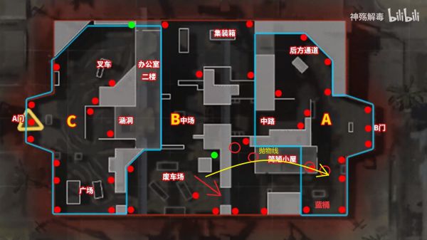 我们都知道从下路进攻A点必经废车场,而废车场被敌人占领后在经常废车附近的这四个位置(如图所示)卡着广场入口,有时候柱子里面也会藏有敌人。