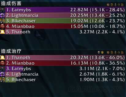 且不谈bis特质在硬度上能带来多少提升,即便缺失防御向特质,也可以通过调整天赋来弥补。反倒是高装等高力量以及一般般的dps向特质可以在进攻端带来提升,这在大秘境需要限时通关的环境下也有很好的收益。这里发一张全程的伤害和自疗。