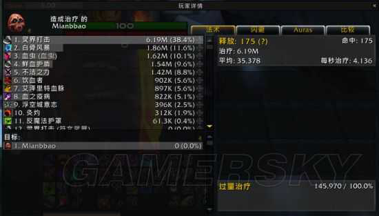 而整个副本中打出灵打的次数为175次,假定没有能量溢出的话,碎心打击大约带来1/7的额外灵打。从这两张图中发现,灵打的伤害和自疗占比分别为11.8%和38.4%,换算之后碎心带来的额外伤害/自疗收益分别为1.7%和5.5%。相比于饮血者7.8%和5.6%的伤害/自疗占比明显占下风。