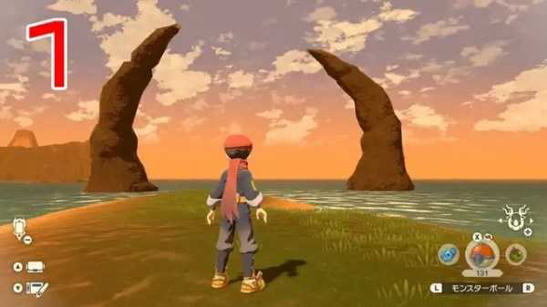 在傍晚携带『小球飞鱼』、『泳圈鼬』、『万针鱼』前往『海岸基地(群青海岸)』穿过东北边(右上)的岩石拱门。