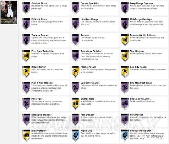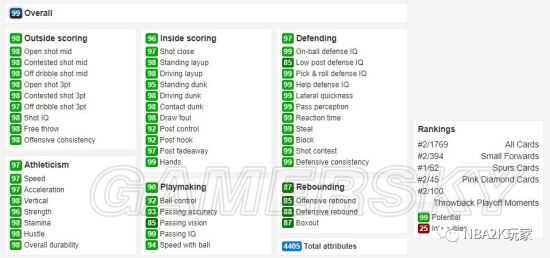 这张粉钻伦纳德的属性数值与上方的J博士一样非常惊人,在无形资产最低25的情况下,总值来到了4405,也让4402的詹姆斯降到了第三位,这张球员卡总体看来仅有篮板稍低,给到了87的综评。细项中除了篮板之外仅传球视野和低位防守智商给到了稍低的85,其余均在90以上。两连DPOY的伦纳德防守能力尤为恐怖,除了低位防守智商和盖帽之外,其它细项均为99满分!从徽章上来看,8+17共计25枚徽章,内突外投的名人堂徽章射程无限、远距离、接球投篮、隔扣等都没少给,防守徽章持球防守、持球抢断、追帽等自然更不会少。当然了,永远不会有完美无缺的球员,这张粉钻伦纳德除了篮板能力之外唯一欠缺的应该就是组织类徽章了。