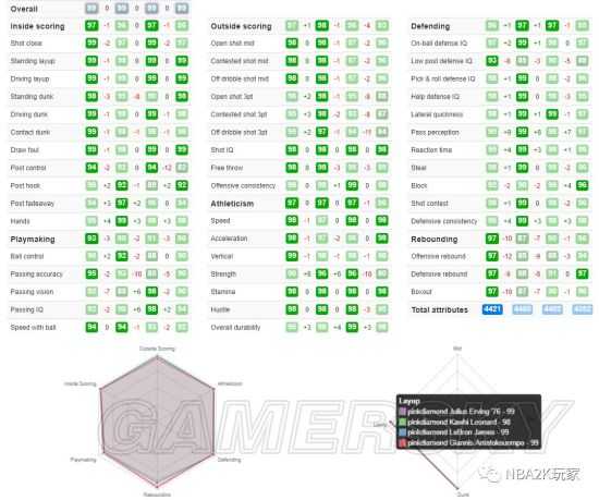 这四个小前其实各方面都非常突出,如果玩家朋友们一定要做出选择的话,有两种方法可以参考,正常来说还是看各自优势,J博士强在内线得分能力;伦纳德强在外线投射及防守能力;詹姆斯则拥有着16+18最广的徽章涵盖;字母哥凭借其身高臂展优势在小前锋这个位置上予取予求。还有一种方法就是错位使用了,如果有朋友非常喜欢这几名球员,要一起上首发的话,可以用J博士去打分位,詹姆斯去打控卫,字母哥打大前,伦纳德打小前。其实小编认为,到了这个阶段的粉钻球员卡,尤其是这几张小前的粉钻卡,都全面的可怕,各项数值差距微乎其微,徽章差距也可以自己补足,还是那句老话,全凭喜好吧。