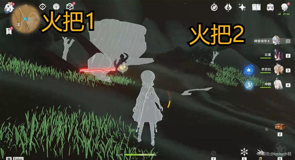 随后能看见未解锁的秘境,旁边有个开关被锁住,周围有几个火把,需要切除火元素角色点燃周围的四个火把,才能打开开关。