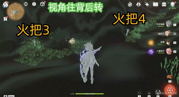 切出宵宫/安柏等火元素角色,点燃四周的四个火把即可解开开关的封印。面前两个,背后两个