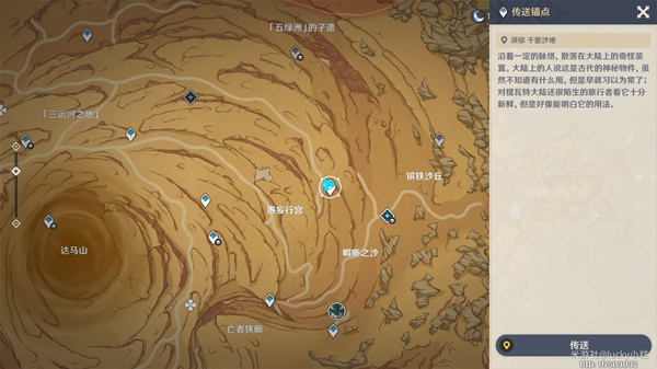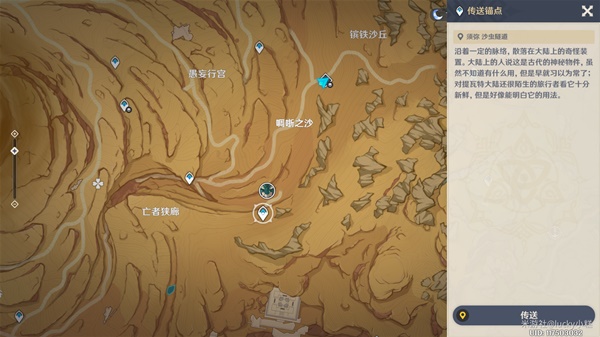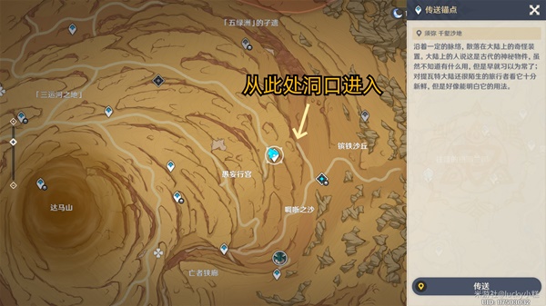 从下方沙虫隧道传送锚点,跳进沙虫的坑里,然后沿路向北到达秘境位置也可。这个路线适用路线1中传送锚点没有开的旅行者。