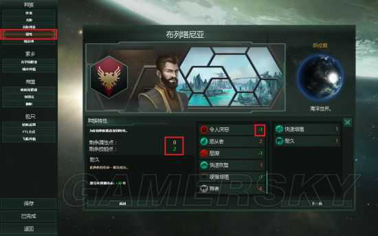 1,国家属性,一共4个槽只能有+2点的值,你可以和我一样选+1+1,也可以-1-1-1+5,反正总和是+2点就行了,讲道理+5的技能我看也一般,然而-1的都要命....我决定还是拿个续30秒和取消计划生育就好了