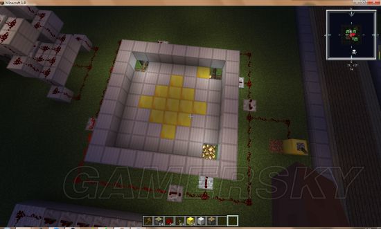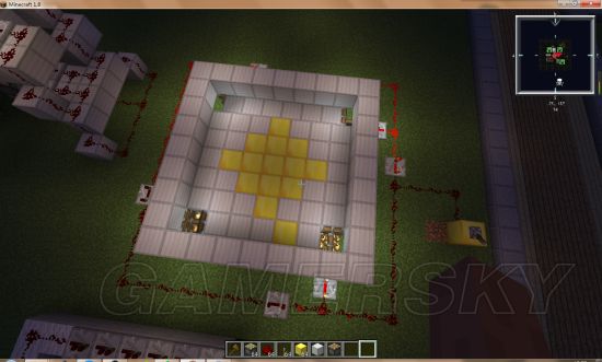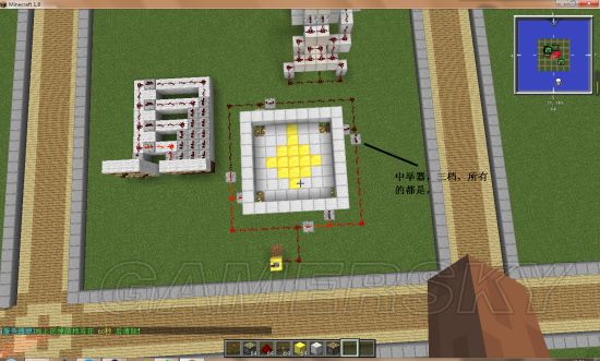 就是四个活塞顺时针推动方块。放红石和中举器看图片,要先按着顺序,从开始点