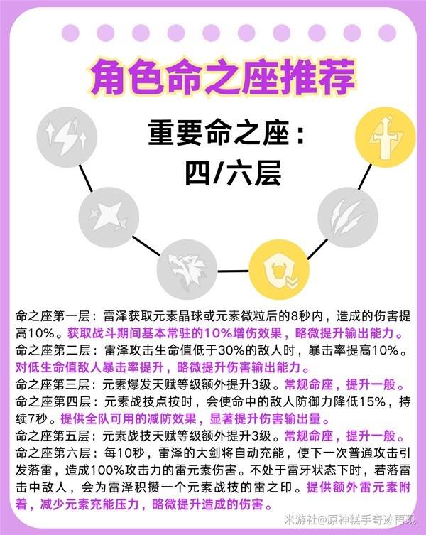 命之座第六层:每10秒,雷泽的大剑将自动充能,使下一次普通攻击引发落雷,造成100%攻击力的雷元素伤害。不处于雷牙状态下时,若落雷击中敌人,会为雷泽积攒一个元素战技的雷之印。提供额外雷元素附着,减少元素充能压力,略微提升造成的伤害。