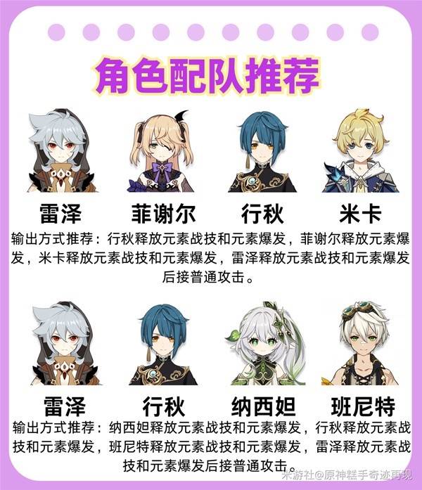 ⑥配队方面,雷泽的配队一般是物理队,物理队中需要带上一个冰元素角色触发超导,再带上一个雷元素角色触发双雷共鸣;也可以选择元素反应玩法(彩虹雷泽),需要选择草元素、水元素、火元素各一名角色组队~