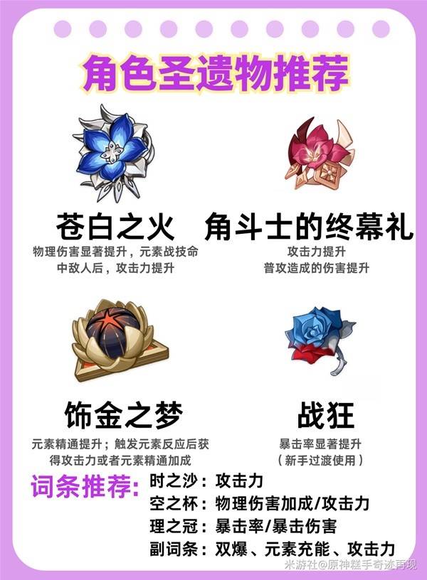 *图中词条推荐针对普通物理玩法,如果选择元素反应(彩虹)玩法,主词条推荐均选择元素精通,副词条也优先考虑元素精通,再考虑其他词条~