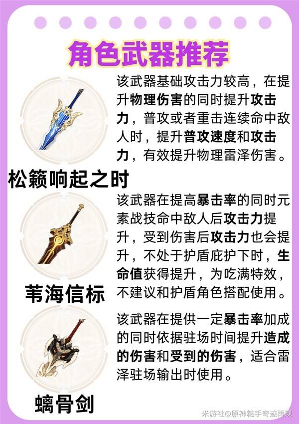③武器选择方面,五星武器方面,雷泽的首选武器推荐松籁响起之时,该武器基础攻击力较高,在提升物理伤害的同时提升攻击力,普攻或者重击连续命中敌人时,提升普攻速度和攻击力,能有效提升物理雷泽伤害;
