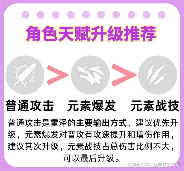 ④战斗天赋升级方面,普通攻击是雷泽的主要输出方式,建议优先升级,元素爆发对普攻有攻速提升和增伤作用,建议其次升级,元素战技占总伤害比例不大,可以最后升级。