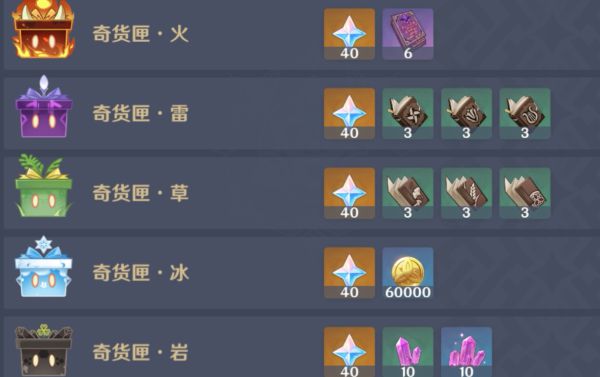 百货奇货一共分七种箱子,旅行者们连续七天按照要求提交立本所需要的材料即可获得奖励。