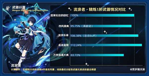 就面板计算来说,这是一把超越「图莱杜拉的回忆」的武器,前提是有人帮助烧血,且这个角色必须要有足够自洽的入队逻辑,不然并不推荐流浪者使用这把武器,在护盾角色的保护下,默认金流监督不触发特效,则其期望伤害为90.65%。