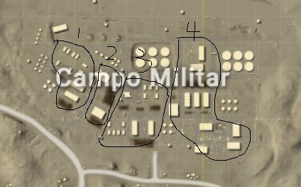 军事基地可以分成4个人搜,左侧一人,中心两栋楼一人,最右侧大厂房一人,剩下的被中心楼房和最右侧大厂房夹在中间的小绿营,高台和厂房是最后一个人。一般来说,基本上每个人都可以2级套毕业,1-3把98K不等,2-4把M4或SCAR。不过也有其缺点,配件过少,药的刷新率也较低。而且有极大地概率距离圈很远。据我自己的经验来看,只要到达军事基地的时间距离缩圈时间大于2分半,最好3分钟以上,就可以获得足够的物资。当然,最好在飞行的途中注意下周围的城市有没有人,我们曾经4个三级头都被附近城市的老哥们安排的明明白白,汽车BOOM,送了4个三级头,4把98K。
