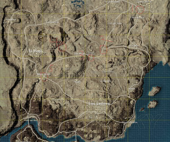 搜完物资,首先是活着出圈,沿线的大城市我建议一个都不要进,绕开就好,这时候一般全图只剩下50人左右了,基本上兵不血刃战胜了一半对手(当然,因为我枪法菜)。进圈以后,我一般喜欢在某一个路口堵人(就是那种进入毒圈连接好几个路的岔路口),因为这个时候从毒圈跑毒的人通常不满血,甚至于不是满员。如果你们队伍有个强力狙击手的话这样的体验一般是好到MAX。不过一般来说,我遇到的老哥都和我差不多猥琐(菜),不喜欢大摇大摆地过马路。下图是我经常堵人的位置,红色的12345。基本上都在地图的中上部分,因为我比较少去下半区。