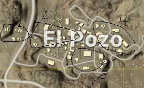 至于野点,相对前两个点来说不太富有,不过胜在人少,跑路的可选择余地很大。而且最关键的是,因为接近地图的中心,所以无论安全区如何刷你都有足够多的时间反应。我个人比较喜欢1+1+1+1的战略,即4个人4个烂尾楼(如图黑色圈1234)。不过如果没人的话,我建议可以把城市附近那两个靠在一起的烂尾楼搜一搜(红色圈1和2),还是挺肥的。如果遇见人抢的话,1V1我选择战斗,如果人更多的话,我只能说,告辞!