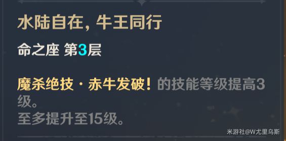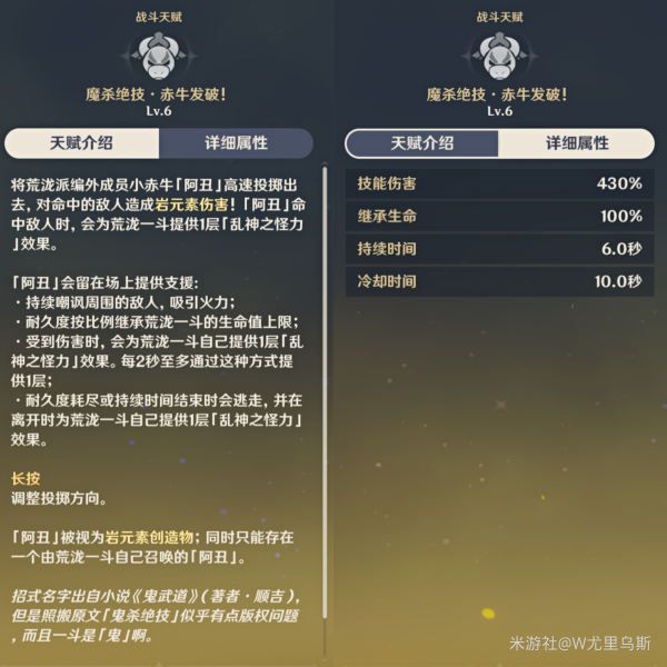 别小瞧这头牛,开启大招丢出去伤害非常的高,阿丑命中敌人可以产3~4颗岩元素颗粒。阿丑还会嘲讽敌人,继承一斗100%的生命值,阿丑在命中敌人或消失时候都会给一斗提供一层BUFF,持续受到攻击每2秒只能提供一层BUFF。