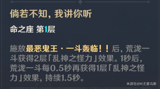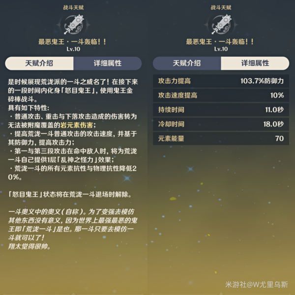 一斗的大招:虽然技能说明是,持续11秒冷却18秒,但大招的持续时间是从动画结束后开始计算。而冷却时间是从演出动画开始的时候就开始计算。因此0命一斗的大招实际真空期大约5秒左右。大招持续时间,会将武器转化为无法覆盖的岩属性。提升自身10%的普攻速度。将自身的防御力转化为攻击力。