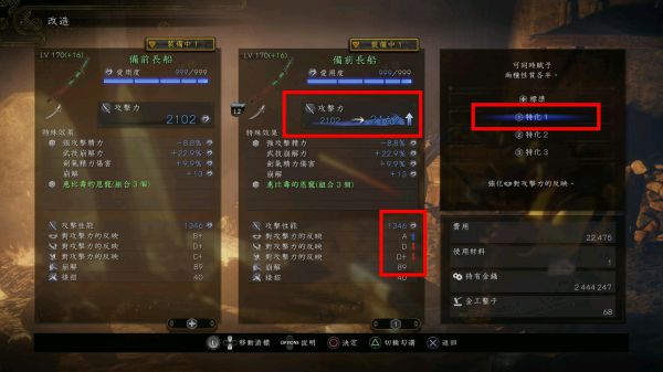 改造功能可以改造武器的补正和装备的防御力。