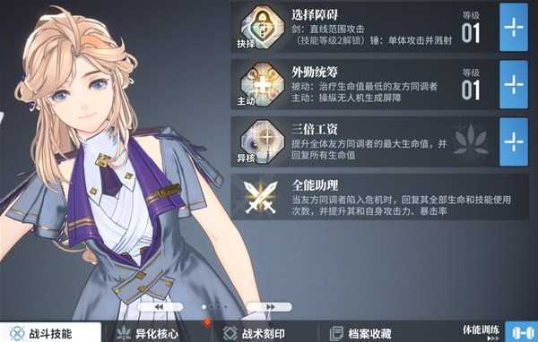 角色技能等级升级同样需要消耗海隅点数和各类需要挑战副本获取的特殊材料,以及专门提升技能等级的训练芯片材料。推荐玩家们升级技能的时候优先考虑升级主动技能,以五星角色苏筱来举例,被动技能选择障碍伤害每次升级只能提升苏筱的固定普攻伤害,而主动技能外勤统筹不仅能够提升苏筱对友方的治疗效果,还能够生成一个防御敌方投射物的屏障,功能性要更胜一筹。而同调者狄砚的主动技能弹雨韶华更是该输出角色的主要伤伤害来源。
