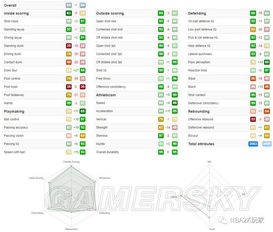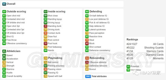 这张钻克莱的属性总值为3663,属性六大项中有两项落在高光区(外线得分、防守)、两项落在绿区(运动能力、内线得分)、一项落在黄区(组织能力),还有一项落在红区(篮板能力)。