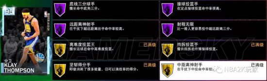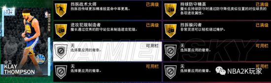 前几天刚说库里独占钻卡名人堂射程无限徽章,结果2K大方的一次性给了这张克莱4枚名人堂徽章!这在目前的钻卡中是绝无仅有的。这张卡徽章的空槽其实可补空间并不大,因为投射方面的所有徽章都齐了,组织徽章和内线徽章大家可以应自己需要打上一些。