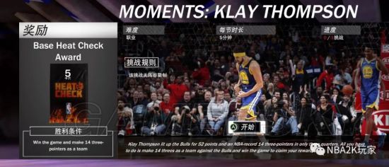 今天早上2K放出了克莱的时刻挑战,挑战要求是在全队命中至少14记三分的情况下,战胜职业难度的公牛队,完成奖励是一包基础状态爆棚卡包。