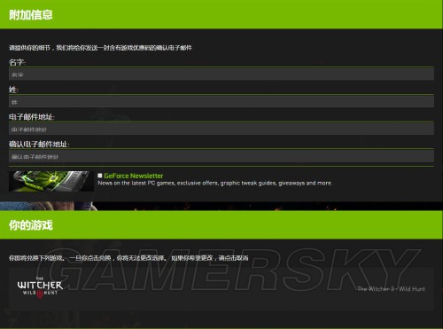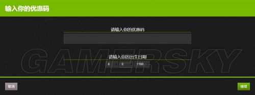 去这个网站:,前往NVIDIA的优惠码兑换网页,上方将巫师3优惠码输入进去,下方选择出生日期(须已满18岁),然后“继续”进行下一步。