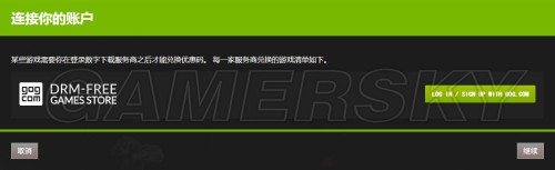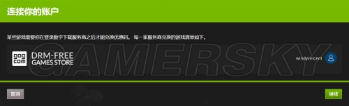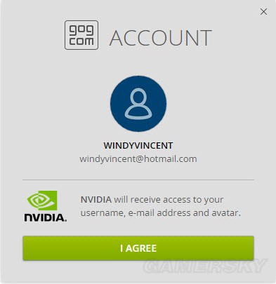 在弹出的页面中登录GOG平台账号,并下方绿条“I AGREE”同意NVIDIA使用账号信息的授权。