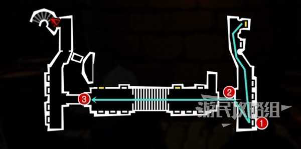 ③放下吊桥,击败出现的敌人。穿过通往中央大厅的楼梯,返回现实世界