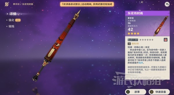 《原神》3.3版本活动秋津森夜试胆会中完成特定关卡即可获得四星武器“东花坊时雨”,许多小伙伴可能还不太清楚该如何精炼。下面就为大家介绍一下《原神》3.3限定武器东花坊时雨获取及精炼方法,希望对大家有所帮助。