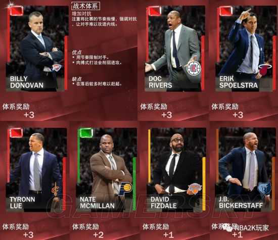 目前2K19中教练卡质量分布有一点比较有趣,所有教练中的四张红宝石质量卡均属于增加对抗系,这四人分别是雷霆教练多诺万、快船教练里弗斯、热火教练斯波和骑士教练卢指导(属性奖励+3)。