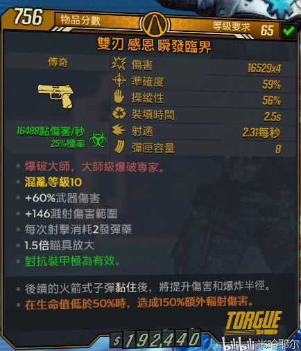 dlc4新手枪,Boss邪恶莉莉丝掉落,经典的托格厂粘弹枪,配合红字效果建议全程使用粘弹模式,莫泽使用伤害非常可观。