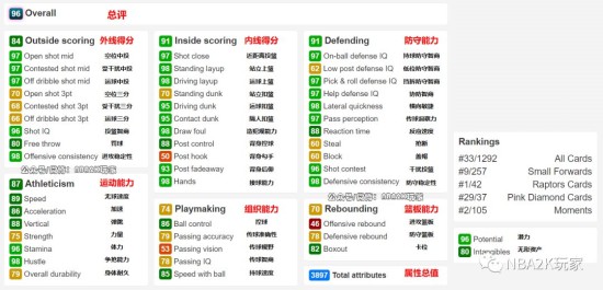 这张伦纳德粉钻的属性总值为3897,六大项中有两项高光(内线得分、防守能力)、两项绿区(外线得分、运动能力)和两项黄区(组织能力、篮板能力)。