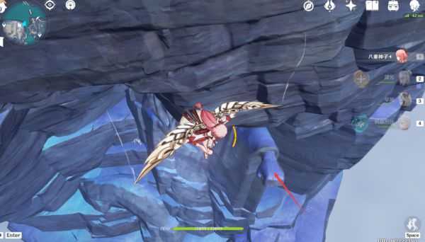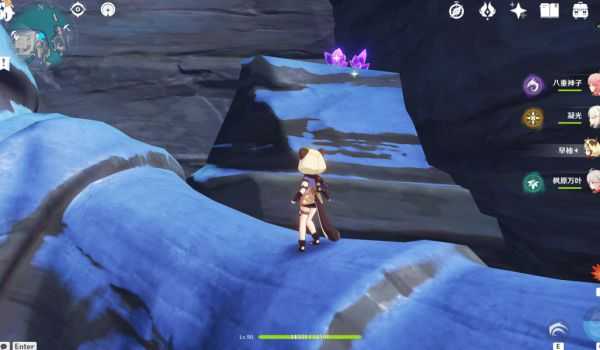 4.蛇心之地北边传送点,往正东方向冲刺加滑翔到达悬崖边,跳下去缓慢下落,降落到大拳头处,沿着手臂走几步右手边即,此处2个紫晶块
