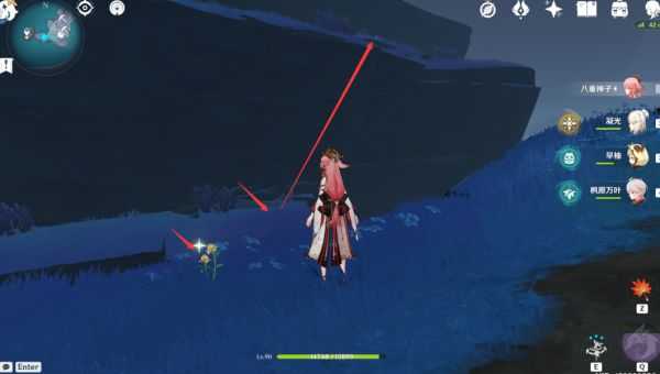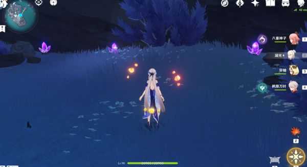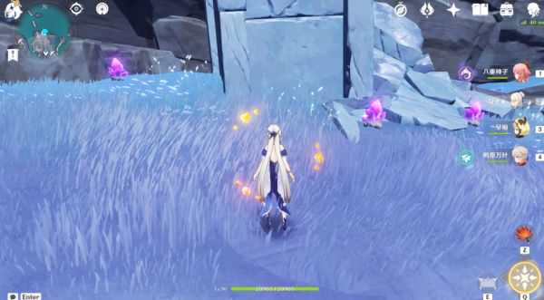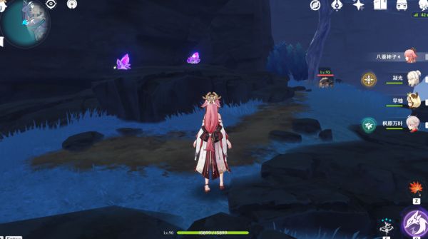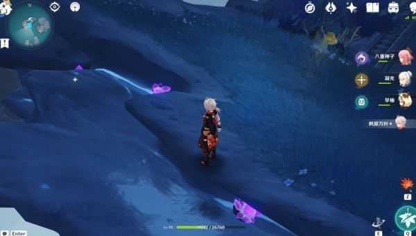 7.传送到常夜灵庙最北方的传送点转,转西南方视角,走到草垛跳下去,右手边回头看,山体夹角处藏着2个紫晶块