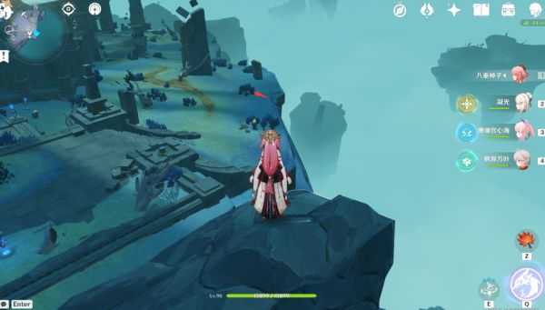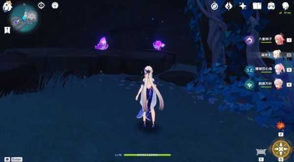 2.歧之地传送点,往东方向沿着浮空石桥走到下一个平台,甜甜花处往东北方向平台滑翔,爬上高处平台,再往东方向走几步即可看到4个紫晶块