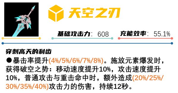 天空之刃为较为通用的辅助向武器,武器本身素质并不高,但较为可观的基础面板以及恰到好处的55.1%充能加成,使得其成为较为依赖基础攻击力和充能的班尼特的可选武器。给同样缺乏充能的琴也较为合适。不过相对而言,佩戴天空之刃对玩家提升较为稀松,也仅仅是有人能用的水平。