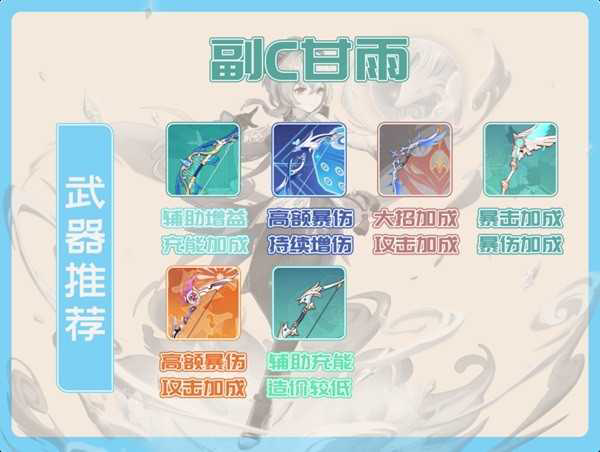 副C甘雨选择武器时需要关注武器对甘雨元素爆发的增益效果及对队友的辅助效果,具体的武器腿甲及武器特性如下,大家可以根据自己的账号配置来选择。