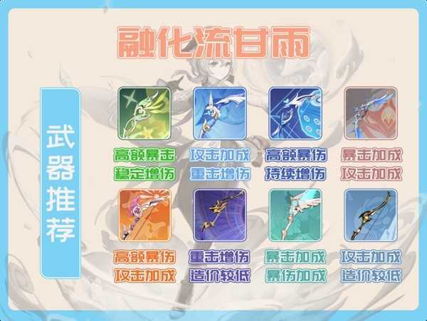 融甘中的甘雨选择武器时需要关注武器对甘雨打增幅反应的增益效果,具体的武器推荐及武器特性如下,大家可以根据自己的账号配置来选择。