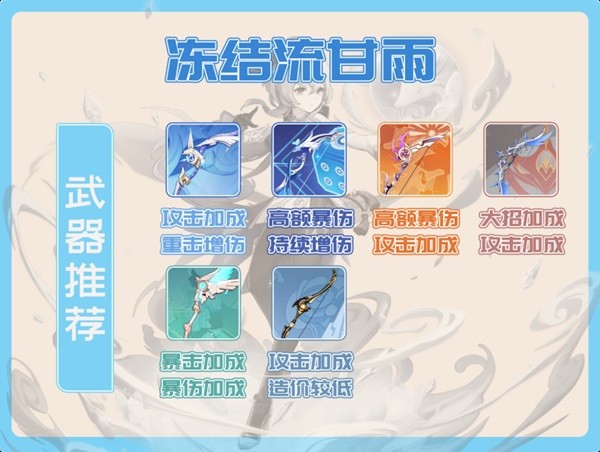 冻结流甘雨选择武器时需要关注武器对甘雨元素爆发与蓄力箭直伤的增益效果,具体的武器推荐及武器特性如下,大家可以根据自己的账号配置来选择。