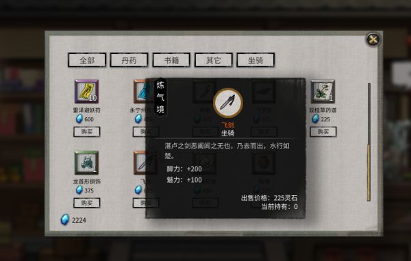 来到大地图,我们第一件事就去找主城,路上遇到城镇就看看飞剑是不是加脚力200的,如果是就买下来装了。