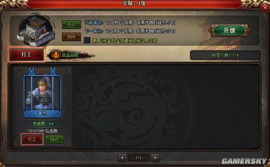 玩家可以对俘虏到的其他玩家的将领进行打工并获得奖励,打开牢狱可在将领俘虏处看到“打工”按钮: