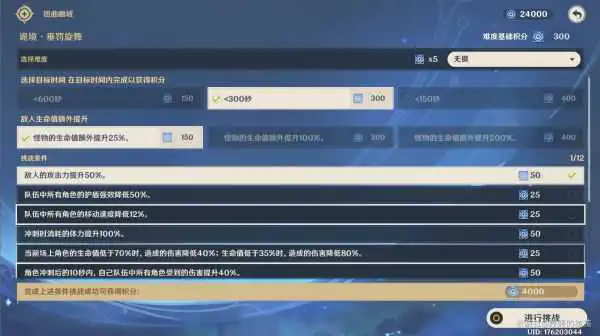 3.个人感觉选择300和25更加合理,这样选择之后已经有保底3750分数了,只需要我们在挑战条件里面选择50积分即可满足4k分的要求。