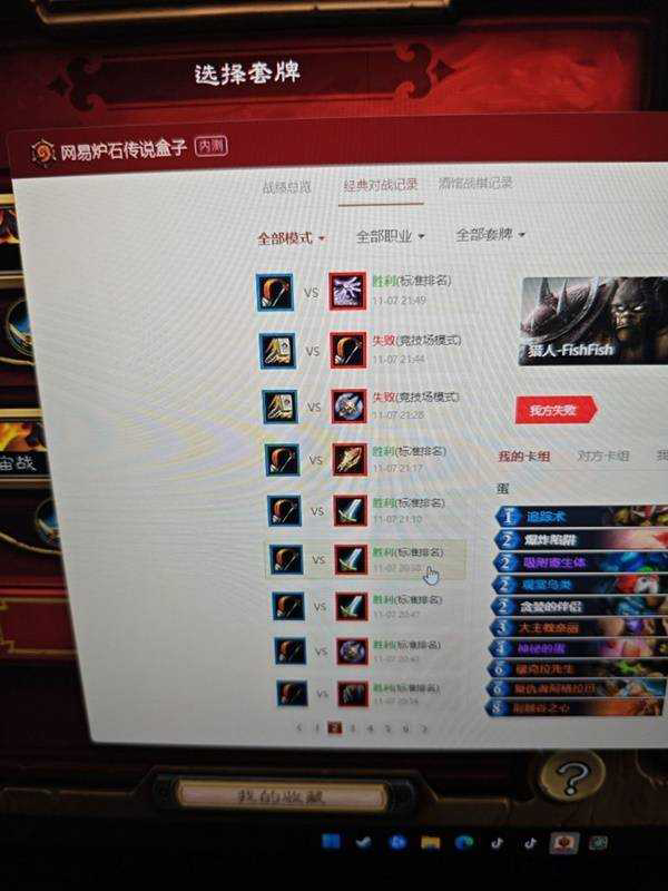 上个月一直打机枪战,就是补水战或者防战,带照相加学徒,可惜改来改去还是在钻五到钻二反复摩擦,偶尔打满四发弹夹很爽就是,后面抄了套蛋猎很是厉害,差两把传说到现在偶尔玩玩一路连胜上传说,自己改了一个点,去掉一张发现加了一个牛,现在有大主教莱丽中后期根本不缺发现,牛里放了另一张发现,一张老鼠,一张专门打轮盘术的法术,一般不带牛的蛋猎打术士劣势,这张属于翻盘卡可以无脑拿,实在卡手就拿发现,老鼠打战士拉key牌或者有场面拉出来用穆克拉撞掉!